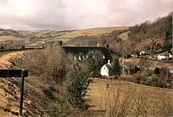 ![]() Knucklas Viaduct, on the Heart of Wales Line, and the village of Knucklas beneath | |