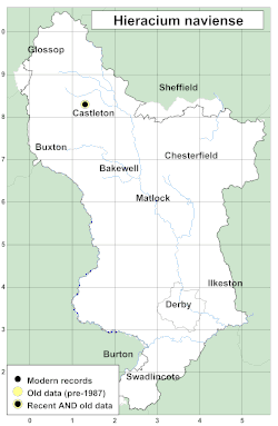 Like many apomictic species of Hieracium, it has an extremely localised distribution and requires specialist knowledge to recognise it. Apart from the two limestone cliffs found within a single 1 km square in the Derbyshire Peak District, it has never been recorded anywhere else in Britain, or indeed the world. The only other vascular plant endemic to Derbyshire (i.e. found nowhere else) is the bramble Rubus durescens.[3]: 89