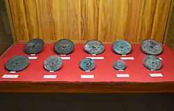 The tumulus has two burial chambers, one in the posterior and one in the anterior portion, both parallel to the main axis of the burial mound. Since the posterior portion was broken into and partially destroyed by grave robbers, an emergency archaeological excavation was conducted by the Inuyama City Board of Education in 1973. A vertical-type stone chamber with a gravel floor was found, with the surfaces of the walls and ceiling covered in clay and painted in vermillion. Many grave goods were recovered, including eleven ancient bronze mirrors, magatama and cylindrical beads, jade balls, wheel-shaped stones, iron implements (including swords, daggers, spears and agricultural implements) and a cracked bamboo-shaped sarcophagus. From these grave goods, it was estimated that the kofun dates from the late 3rd to early 4th century, making it one of the earliest in Owari Province. All of the excavated items were designated as Important Cultural Properties of Japan in 1978[3] and are now stored at the Kyoto National Museum.[2]