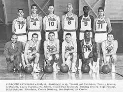 Prior to the 1948–49 season, four teams left the NBL for the BAA as the foundation for a merger was laid.[3] Staying in the NBL, the Nationals signed Al Cervi to be a player coach as Dolph Schayes made his professional debut, leading the Nats to a winning record for the first time with a record of 40–23. In the playoffs the Nationals made quick work of the Hammond Calumet Buccaneers, winning the series in two straight games. However, in the semifinals the Nats fell to the Anderson Duffey Packers for the second straight season in four games. In 1949, when the NBL and the Basketball Association of America merged into the NBA, the Nationals were one of seven NBL teams that were brought into the NBA.