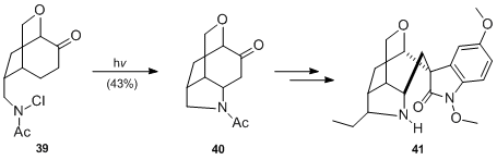 Similarly, S. W. Baldwin and T. J. Doll examined a modification of the Hofmann–Löffler–Freytag reaction during their studies towards the synthesis of the alkaloid gelsemicine 41. The formation of the pyrrolidine ring of 40 was accomplished by irradiation of N-chloroamide 39.[19]