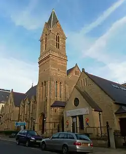 John Wills, a prolific designer of buildings for Nonconfirmist communities, was asked to design a permanent church for the congregation.[6] (One of his later commissions was the Hove Methodist Church.)[7] Congreve paid the full cost of construction and also became the church's first treasurer.[8] Building work took place during 1887, and the first service was held on 29 July 1887. Charles Spurgeon, an influential Baptist preacher, was invited, but he could not attend because of illness.[6] He helped in other ways, however: he sent his brother to preach in his place at the inaugural service and selected the church's first pastor; and one of his sons took this role subsequently.[8] The first pastor, Rev. David Davies, served from 1887 until 1907; on his initiative, Gwydyr Mansions—an "elegant" block of mansion flats in the Flemish Renaissance style[9] were built opposite the church in 1890.[10]