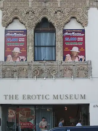 The six thousand square foot space was also home to the Erotic Museum Hall of Fame, whose eight inductees included Hugh Hefner.[2][5]
