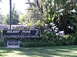 The neighborhood is home to two parks: Holmby Park and De Neve Square Park.[6] The former, Holmby Park, includes two playgrounds, a nine-hole putting green called the Armand Hammer Golf Course, and a classic lawn bowling, home to the Holmby Park Lawn Bowling Club started in 1927.[6][15] It is located next to the Los Angeles Country Club.[15]