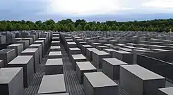 Berlin showcases another Holocaust memorial landscape: the Memorial to the Murdered Jews of Europe. Designed by Peter Eisenman, the memorial consists of 2,711 concrete steles, of different heights through which visitors can walk. While Eisenman does not explicitly explain the meaning behind these forms, Constanze Petrow speculates that their collective form provides both a recollection of traditional Jewish cemeteries as well as a sense of loss of the Jewish community through the contrast of the quiet space of the memorial with the noise of the surrounding city.[7]