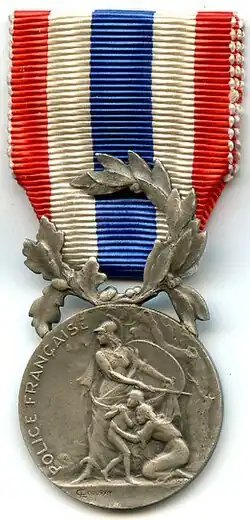 The Honour medal of the National Police, a design of engraver Marie Alexander Coudray, is a 27mm in diameter circular silver medal. The obverse bears the relief image of the protecting Republic, in the form of a standing helmeted woman holding a sword and a shield, protecting a kneeling woman pulling a frightened child to her, behind them a tree. Along the right circumference, the semi circular relief inscription "POLICE FRANÇAISE" (English: "FRENCH POLICE").[1]