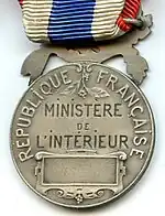 The reverse bears at its bottom a framed rectangular area destined to receive the name of the recipient and year of the award. Along the upper medal circumference, the relief inscription "RÉPUBLIQUE FRANÇAISE" (English: "FRENCH REPUBLIC"), at its center, the inscription "MINISTÈRE DE L'INTÉRIEUR" (English: "INTERIOR MINISTRY").[1]