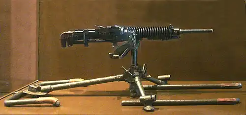 The Hotchkiss was based on a design by Captain Baron Adolf Odkolek von Újezd of Vienna, first patented in July 1889 with further patents following in the following years,[4] tested in 1893 in Saint-Denis, near Paris. The patents had been purchased in 1894–1895 by the firm of Benjamin Hotchkiss. Benjamin Hotchkiss was no longer alive at the time of the purchase, but the Odkolek design was further developed and greatly improved under the direction of American-born Laurence Vincent Benét, son of General Benét. In 1898 an export model was offered for international sales by Hotchkiss and sold to Brazil, Chile, Japan, Mexico, Norway and Venezuela that year. With some useful changes, such as the addition of five cooling radiator rings on the barrel, the same basic design led to the Mle 1900.[5][3] The gun was tested in 1901 by two Chasseur battalions and in 1903–1904 with cavalry units.[6] The French Army bought another 50 Hotchkiss machine guns in 1906 for comparative trials but adopted the more complex Puteaux Mle 1905 (upgraded as the St. Étienne Mle 1907) to equip the infantry in 1907–1909.[7] Nevertheless, 600 Mle 1900 machine guns were also purchased by the French military for use in overseas colonies[8]