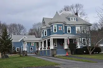 The House at 52 Oak Street in Wakefield, Massachusetts is one of the most elaborate Colonial Revival houses in the Greenwood section of town. The 2+12-story wood-frame house was built in the 1890s. It has significant Queen Anne styling, including a turret and wraparound porch, but porch details such as the multiple columns on paneled piers are Colonial Revival in style, as are the hip-roof dormers. The house was built by Henry Savage, a developer with ultimately unsuccessful plans to develop the Greenwood area residentially in the 1880s.[2]