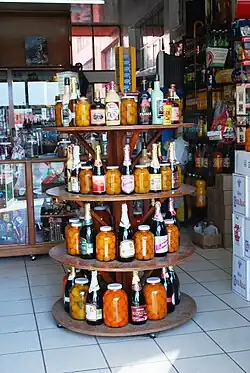 Display of locally produced cider and fruit preserves at a store in the city