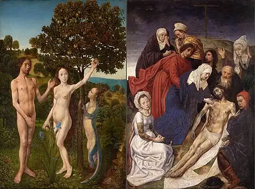 Hugo van der Goes was an important painter of altarpieces as well as portraits. His principal religious works include the Portinari Triptych (Uffizi, Florence), the Adoration of the Magi (also called the 'Monforte Altarpiece'), the Adoration of the Shepherds (both Gemäldegalerie, Berlin), the Fall and Redemption of Man (Kunsthistorisches Museum) and the Death of the Virgin (Groeningemuseum, Bruges).[9]