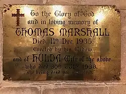 To the Glory of God/ and in loving memory of/ THOMAS MARSHALL/ Died 11th Dec 1935/ Erected by his Widow/ And of HULDA Wife of the above/ Who died 30th July 1938/ “she being dead yet speaketh”.