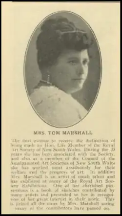 A well-known patron of the arts in Sydney, her role was recognised in 1929, along with that of her solicitor husband, Thomas Marshall, when they were made life-long members of the Royal Art Society, along with Dame Eadith Walker and Dame Nellie Melba.[26][27][28][22][23][29]