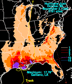 Juan was the last of three hurricanes to move over Louisiana during the season, after Danny in August and Elena in early September. It formed rapidly over the northern Gulf of Mexico, allowing little time for thorough preparations or the evacuation of offshore oil rigs. As a result, nine people died in maritime accidents off Louisiana. Onshore, the hurricane dropped torrential rain totaling 17.78 in (452 mm) in Galliano, Louisiana. The combination of the rainfall and a high storm surge flooded 50,000 houses and many communities in southern Louisiana, causing extensive agriculture losses. Damage in Louisiana alone approached $1 billion (1985 USD). Elsewhere, flooding in Texas forced the closure of roadways, while heavy rains damaged crops and houses in southern Mississippi. The outer rainbands of Juan spawned 15 tornadoes along the Florida Panhandle, causing over $1 million in damage. Overall, Juan directly inflicted about $1.5 billion in damage, making it among the costliest United States hurricanes, and caused 12 deaths. This excludes the effects from the subsequent flooding in the Mid-Atlantic.