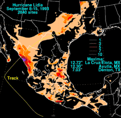9. ^ a b c d e f g Pasch, Richard J. (November 28, 1993). "Hurricane Lidia-8-14 1993 September Preliminary Report Page 2". National Oceanic and Atmospheric Administration. National Hurricane Center. Retrieved October 8, 2011.