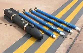![]() Four dummy (inert) Hydra 70 rockets next to an AGM-114 Hellfire | |