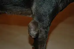 A hygroma, or a false bursa, is a discrete, fluid-filled sac that can form on the joints of dogs in response to repeated pressure, such as that from sitting on a hard surface.[1] It is treated by draining the fluid and may be prevented by providing padded bedding.