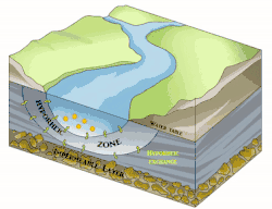 The hyporheic zone is the area of rapid exchange, where water is moved into and out of the stream bed and carries dissolved gas and solutes, contaminants, microorganisms and particles with it.[4] Depending on the underlying geology and topography, the hyporheic zone can be only several centimeters deep, or extend up to tens of meters laterally or deep.