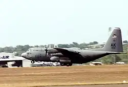 McLennan had at his disposal 13 Royal Australian Air Force (RAAF) Lockheed C-130H Hercules transport aircraft of No. 86 Wing RAAF Detachment B based at RAAF Base Amberley, RAAF Base Darwin and RAAF Base Tindal, under the command of Squadron Leader Simon Giles.[55] This was augmented by two C-130Hs of the No. 40 Squadron, Royal New Zealand Air Force (RNZAF), with six crews,[41] and a single C-130H with two crews and ten maintenance personnel from the US 517th Airlift Squadron. Normally based at Elmendorf Air Force Base in Alaska, it had been supporting the visit to New Zealand by President Clinton for the Asia-Pacific Economic Cooperation (APEC) summit. This contribution was subsequently increased to four C-130Hs, with 20 aircrew and 33 maintenance personnel,[56] the additional aircraft and personnel being drawn from the 613th Air Expeditionary Group.[57]