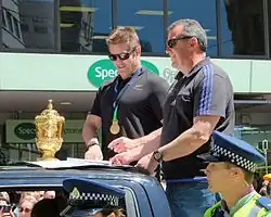 Foster with Richie McCaw during the 2015 Rugby World Cup victory parade
