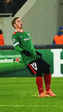 On 1 December 2013, Muniain was again the sole name on the scoresheet at the new San Mamés Stadium, to hand FC Barcelona their first league loss of that season.[26] Eighteen days later, he celebrated his 21st birthday by grabbing a brace in a 4–0 domestic cup home victory against RC Celta de Vigo, which signified his team progressed through to the round of 16 4–1 on aggregate.[27] In that period, media reports suggested that his progression as a footballer in his 20s had slowed after showing such high potential as a young teenager.[28][29]