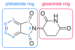 The thalidomide molecule is a synthetic derivative of glutamic acid and consists of a glutarimide ring and a phthaloyl ring (Figure 5).[15][16] Its IUPAC name is 2-(2,6-dioxopiperidin-3-yl)isoindole-1,3-dione and it has one chiral center[15] After thalidomide's selective inhibition of TNF-α had been reported, a renewed effort was put in thalidomide's clinical development. The clinical development led to the discovery of new analogs which strived to have improved activities and decreased side effects.[8][17]