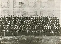 In 1895, the Imperial Attendant Guard served as the army's core and palace guards.[7] The Attendant Guard grew to two battalions of 1,700 troops, each battalion consisting of companies of 220 men. In March 1896, Gojong added three more battalions to the Attendant Guard, establishing a total of five battalions with 4,400 men.[18] The Ministry of the Interior assigned the 3rd battalion as the Imperial Retinue Guard. They were directly in charge of escorting the Imperial Family nearby, and Gojong was in charge of the Retinue Guard before the Gabo Reform.[7] But after the reform, the Ministers of the Palace, Military, Finance, and Education concurrently holds the position of commander of the Attendant Guard.[18][21] They reorganized the Retinue Guard into an engineer corps. Still, they disbanded due to unstable domestic situations.[21][22] On April 22, Gojong reorganized two battalions into one regiment divided by ten companies which followed the Russian military system. It consisted of one independent battalion, and another battalion into a cavalry battalion.[18][22] In 1900, Gojong reestablished the Retinue Guard with 730 soldiers.[7][21] In 1902, the Attendant Guard expanded to two regiments.[22]