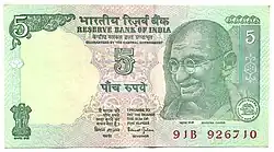 The Indian 5-rupee note (₹5) is the second smallest Indian note in circulation. The Reserve Bank of India introduced the 5 rupee banknote as part of the Mahatma Gandhi Series in 1996.[1] The printing of notes in the denominations of ₹5, however, has been discontinued as these denominations have been coinised but still these notes are valid legal tender in India.[2][3]