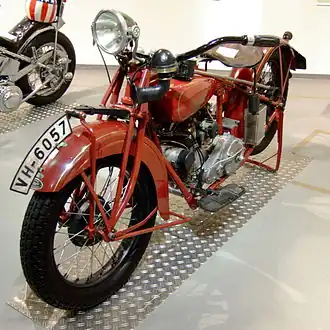 Designed by Charles B. Franklin,[1][3] the Scout was introduced in October 1919 as a 1920 model. The Scout had a sidevalve V-twin engine with its transmission bolted to the engine casing, allowing a geared primary drive - the only American v-twin to use this maintenance-free system.[4] The Scout engine initially displaced 606 cc (37 cu in), but the engine size was increased to 745 cc (45 cu in) in 1927 in response to the popularity of the Excelsior Super X.[1][5] In early 1928, a front brake was added to the Scout.[6]