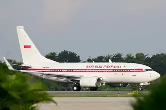 Previously the main presidential aircraft was a Boeing 737-800/BBJ2. The call sign of this aircraft is "Indonesia One", "Indonesian Air Force 01" or "IDAF01" with registration number "A-001".[1] The aircraft belongs to the Ministry of State Secretariat, operated by the Indonesian Air Force's 17h Air Squadron,[2] and maintained by GMF AeroAsia.[3][4]