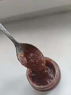 A small jar of pureed plums. A baby who is just beginning to eat baby food might not swallow even one small spoonful.