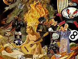 The collage on the album cover was created by Smith[22] and is called God Told Me to Skin You Alive, a reference to the Dead Kennedys song "I Kill Children". The cover art contains an image (the dentist) that was originally used in a collage featured in the inside cover art of Dead Kennedys' album Plastic Surgery Disasters (1982). Smith knew drummer Tré Cool from Green Day's time at Lookout! Records and told Cool that if he ever needed album artwork that he should call him.[21] The cover art features several hidden images: a naked woman, three fairies, and several other ghostly faces in the flames.[21] There are also three skulls on the entire album cover and back, one for each member of Green Day. One of the skulls requires the viewer to tilt the piece at an angle. The hidden skull is taken from Hans Holbein's 1533 painting The Ambassadors.[21] Green Day's version, however, is slightly different from the original, with the woman holding Armstrong's iconic Sonic Blue Fernandes imitation Stratocaster rather than an acoustic guitar.[21]