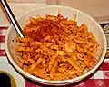 Penne alla vodka The sauce of this pasta dish consists of tomato, onion, ham, cream and vodka.