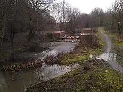 The navigation turns to the west, passing under the railway line, and then loops back to return to the eastern side of the railway. It runs along the northern edge of some railway sidings which form part of Eastleigh Works, to reach Withymead Lock. This was unusual, as it included a bypass channel to take excess water around the lock, whereas the other locks used vents in the gates. Just below the lock, the navigation rejoins the river channel.[38] At Barton Bay, the Barton River leaves the navigation, following a course to the west of the channel. A horse bridge carried the towpath over the river, which used to supply water to Barton Peveril Mill. The next cut began a little further south, with Bishopstoke or Stoke Lock at the head of it.[39][40] There are four bridges on Bishopstoke Road, as it crosses the Barton River, the navigation, the river channel and the tailrace of Shears Mill, Bishopstoke.[41] The mill was a large four-storey building, which was demolished in the 1920s. Four years before demolition, two water turbines of 20-inch (51 cm) and 36-inch (91 cm) diameter were installed, and were retained after the demise of the mill, in the hope that they could be used to generate DC power for the village. Several community groups were looking at the possibility of restoring the water turbines to generate electricity.[42][43]