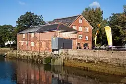 The official head of the canal was at Blackbridge Wharf, Winchester, just to the south of Wharf Mill, a grade II listed water mill dating from 1885, and College Walk, which spans the river at Blackbridge, an eighteenth-century stone bridge which is also grade II listed. Below the bridge, the channel splits, with the river flowing to the west and the navigation to the east. Blackbridge Wharf was accessed by Wharf Bridge, the oldest surviving bridge over the navigation, dating from the 1760s.[24] Close by, the manager's house, a warehouse and some stables have also survived.[25] The navigation flows past the grounds of Winchester College, and under Tun Bridge, which carries Garnier Road, before continuing to the remains of St Catherine's Hill Lock, some 1.5 kilometres (0.93 mi) downstream of Blackbridge Wharf. This lock, which now contains a modern sluice mechanism, was the location of a water-powered sawmill, located to the west of the lock. Winchester College now uses the stretch of the navigation, between their club premises at the head of navigation and a winding hole just above the lock, for rowing practice.[26]