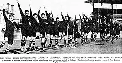 They then moved on to Brisbane to play Queensland at the Brisbane Cricket Ground on 18 June. The day before the game the Courier Mail (Brisbane) wrote “when the giant Jack Brodrick leads his team-mates on the Brisbane Cricket Ground to-morrow, the public, however, will see a team capable of extending Queensland’s best”.[181] Upon arriving in Brisbane the New Zealand team was quick to move to the cricket ground to train. The Queensland side finished their training around 4pm and then the “whole of the home team had a good chance to look over Brodrick, Hemi, McNeight, and company and size them up”.[182] W. Sneyd, a staff photographer with the Telegraph wrote “another forward who will delight the cricket ground spectators is Brodrick, who played here before with the last rugby union Māori team. I saw him then, and I saw him again in Sydney, and he's better than ever. Fast and clever, he backs up like a real champion. I tip tries from this forward in every match”.[183] In another article they said that he “is very fast, and should show out in the open”.[184]
