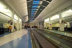The airport covers 7,911 acres (3,201 ha) and has two concrete runways: 08/26, 10,000 x 150 ft (3,048 x 46 m) and 14/32, 7,701 x 150 ft (2,347 x 46 m).[1][14] The terminal at JAX is composed of a baggage claim area, on the first floor and a ticketing area on the second floor, at the front of the structure. Past baggage claim and ticketing is the mezzanine, where shops, restaurants and the security checkpoint are located. Beyond the mezzanine are the airport's Concourses A and C, which include 10 gates each (for a total of 20), along with other shops and restaurants.[15]