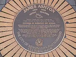 James Ashton commemorative plaque, outside the Town Hall on Norwood Parade.