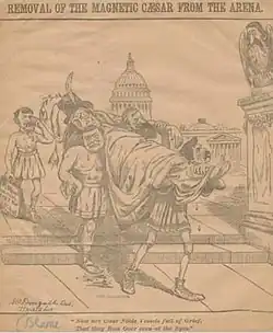 Opinion swiftly turned against Blaine. The June 3 The New York Times carried the headline "Blaine's Nomination Now Out of the Question." Blaine took his case to the House floor on June 5, theatrically proclaiming his innocence and calling the investigation a partisan attack by Southern Democrats in revenge for his exclusion of Jefferson Davis from the amnesty bill of the previous year.[65] He read selected passages from the letters aloud and said, "Thank God Almighty, I am not afraid to show them!" Blaine even succeeded in extracting an apology from the committee chairman. The political tide turned anew in Blaine's favor, but the pressure had begun to affect Blaine's health, and he collapsed while leaving church services on June 14.[66] His opponents called the collapse a political stunt, with one Democratic newspaper reporting the event as "Blaine Feigns a Faint." Rumors of Blaine's ill health, combined with the lack of hard evidence against him, garnered him sympathy among Republicans and, when the Republican convention began in Cincinnati later that month, he was again seen as the frontrunner.[67]