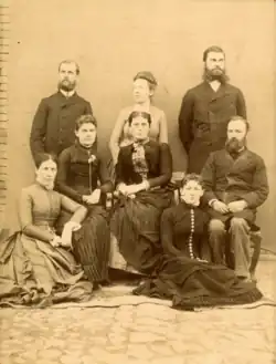 American Missionaries in Hamadan, Iran; with Sarah "Belle" Sherwood Hawkes sitting on floor at right and James W. Hawkes front above