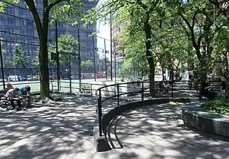 The park is adjacent to the Tony Dapolito Recreation Center, formerly the Carmine Recreation Center in honor of Trinity Episcopal Church vestryman and colonial landowner Nicholas Carman (changed to Carmine to reflect Italians in the area[1]),[2] at the intersection of Carmine and Clarkson Streets with Seventh Avenue South. It was named after a long-time president of Community Board 2, Anthony V. Dapolito, who was known as the "Mayor of Greenwich Village."[3]