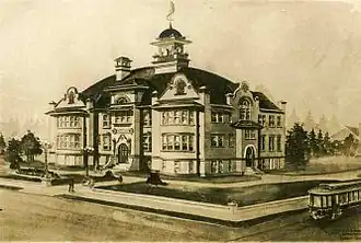Construction of James John High School began in Fall 1909. The building was completed in September 1910 at a cost $40,000 ($1,349,857 adjusted for inflation).[1] In the school's first year, men's and women's basketball teams were formed.[2] There were four students in the first graduating class in 1911.[3] Other events at the school in 1911 included a meeting of the Multnomah County Teachers Institute[4] and the formation and regular meetings of the St. Johns Commercial Club (starting on November 13).[5]