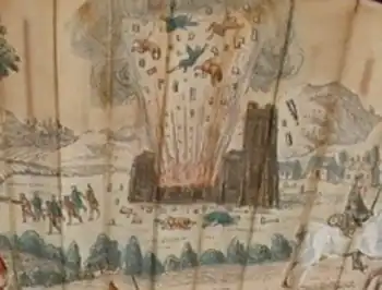 During his period of occupancy, in 1746 St Ninian's Church was blown up as part of the Jacobite Uprising of 1745. The Jacobite forces at gathered on the morning of 1 February 1746 at the church, but Bonnie Prince Charlie was late to arrive. They were trying to organise a systematic retreat of the Jacobite forces due to approaching forces from Edinburgh. Lord George Murray was therefore in charge. At some point, the church which was being used as a gunpowder store, blew up. It is unclear if this was a complete accident or a deliberate act gone wrong (as many people were injured).[2] The congregation met in the West Church of Stirling until a new church was built in 1750.[3]