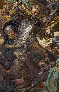 According to the Polish chronicler Jan Długosz,[15] in the following year (1410) Žižka served as a mercenary during the Polish–Lithuanian–Teutonic War. It is assumed that he was on the winning Polish-Lithuanian side of the Battle of Grunwald, also called the 1st Battle of Tannenberg, one of the largest battles in Medieval Europe.[16][17] It was fought on 15 July 1410, and the alliance of the Kingdom of Poland and the Grand Duchy of Lithuania, led respectively by King of Poland Jogaila (Władysław II Jagiełło) and Grand Duke Vytautas (Witold), decisively defeated the Teutonic Knights, led by Grand Master Ulrich von Jungingen. Długosz reports that after the battle, Žižka was serving in the garrison of the town of Radzyń.