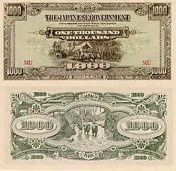 Japanese invasion money, officially known as Southern Development Bank Notes (Japanese: 大東亜戦争軍票 Dai Tō-A Sensō gunpyō, "Greater East Asia War military scrip"), was currency issued by the Japanese Military Authority, as a replacement for local currency after the conquest of colonies and other states in World War II.[1]