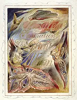 Jerusalem: The Emanation of the Giant Albion (1804–1820, with additions made even later) is a prophetic book by English poet William Blake. Jerusalem is the last, longest and greatest in scope of Blake's works. Etched in handwriting, accompanied by small sketches, marginal figures and huge full-plate illustrations, it has been described as "visionary theatre". The poet himself believed it was his masterpiece and it has been said that "of all Blake's illuminated epics, this is by far the most public and accessible".[2] Nonetheless, only six copies were printed in Blake's lifetime and the book, like all of Blake's prophetic works, was all but ignored by his contemporaries.