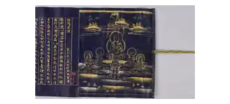 The Jingo-ji Tripiṭaka is a Japanese collection of the Tripiṭaka (Chinese Buddhist canon) composed of over 5400 scrolls made of Indigo dyed paper, and written in golden ink. Created in the twilight of the Heian period, throughout the Genpei War, the compilation of the canon was commissioned by Emperor Toba and Emperor Go-Shirakawa from 1150-1185. The scrolls were then deposited in Jingo-ji, Ukyō-ku, Kyoto. In the years since, 2317 scrolls remained with the temple while many others have been scattered into private collections and museums around the world.[1][2][3]