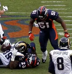 Mays (51) looks on as teammates tackle Steven Jackson on November 28, 2010.