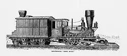 The John Bull was built in Newcastle, England, by Robert Stephenson and Company for the Camden and Amboy Railroad (C&A), the first railroad built in New Jersey.[2][5] It was dismantled and then shipped across the Atlantic Ocean in crates aboard the Allegheny.[3] C&A engineer Isaac Dripps reconstructed the locomotive to the best of his ability (the shipment did not include any drawings or instructions to assemble the locomotive) and ran it for the first time in September 1831.[6][7] On November 12, 1831, Robert Stevens (then president of the C&A) repaid some political debts by inviting several members of the New Jersey legislature and some local dignitaries, including Napoleon's nephew Prince Murat, for rides behind the newly delivered locomotive over a short test track. The prince's wife, Catherine Willis Gray, made a point of hurrying onto the train so she could be declared the first woman to ride a steam-powered train in America, though unknown to her, men and women had already ridden behind the steam powered maiden runs on the Baltimore and Ohio, South Carolina Railroad, and the Mohawk and Hudson by this point in 1831.[3][6][8][9]