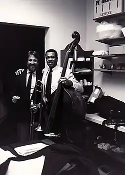 He went on to tour with the Monty Alexander Trio and the Count Basie Orchestra, before taking the position of principal bass in the Amsterdam Philharmonic Orchestra in Amsterdam, Netherlands.[2] After five years he returned to the U.S. for a break from the classical genre and, in 1985, co-founded the Clayton-Hamilton Jazz Orchestra with his brother, saxophonist Jeff Clayton, and drummer Jeff Hamilton.[2] He also performed in a duo as the Clayton Brothers with musicians such as Bill Cunliffe and Terell Stafford.